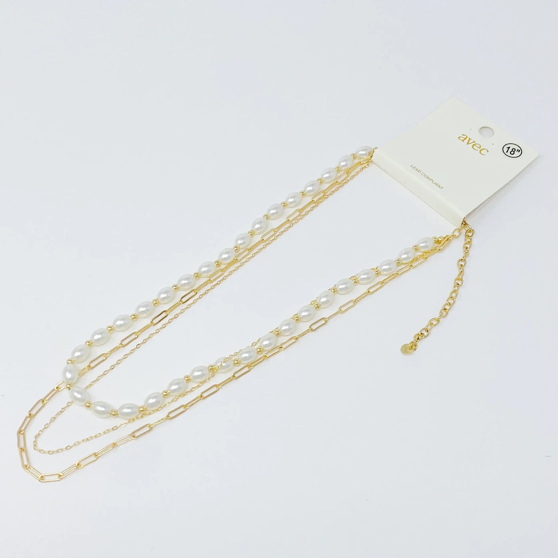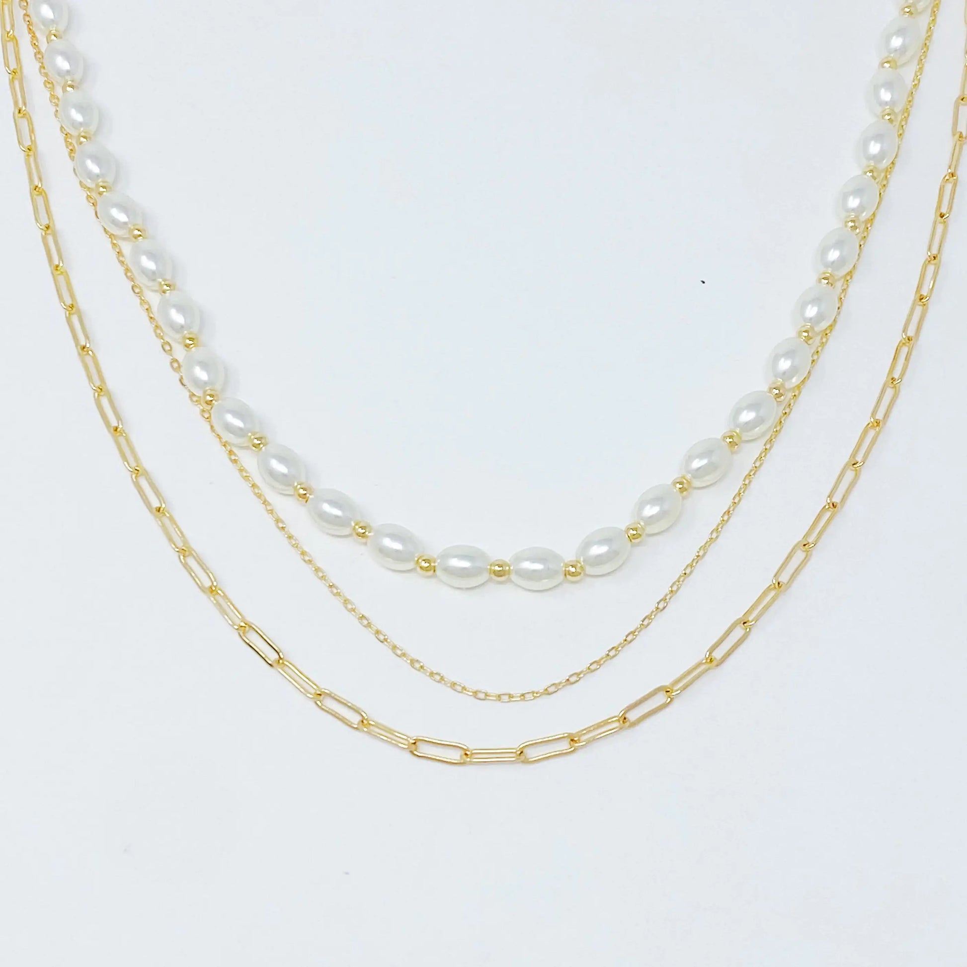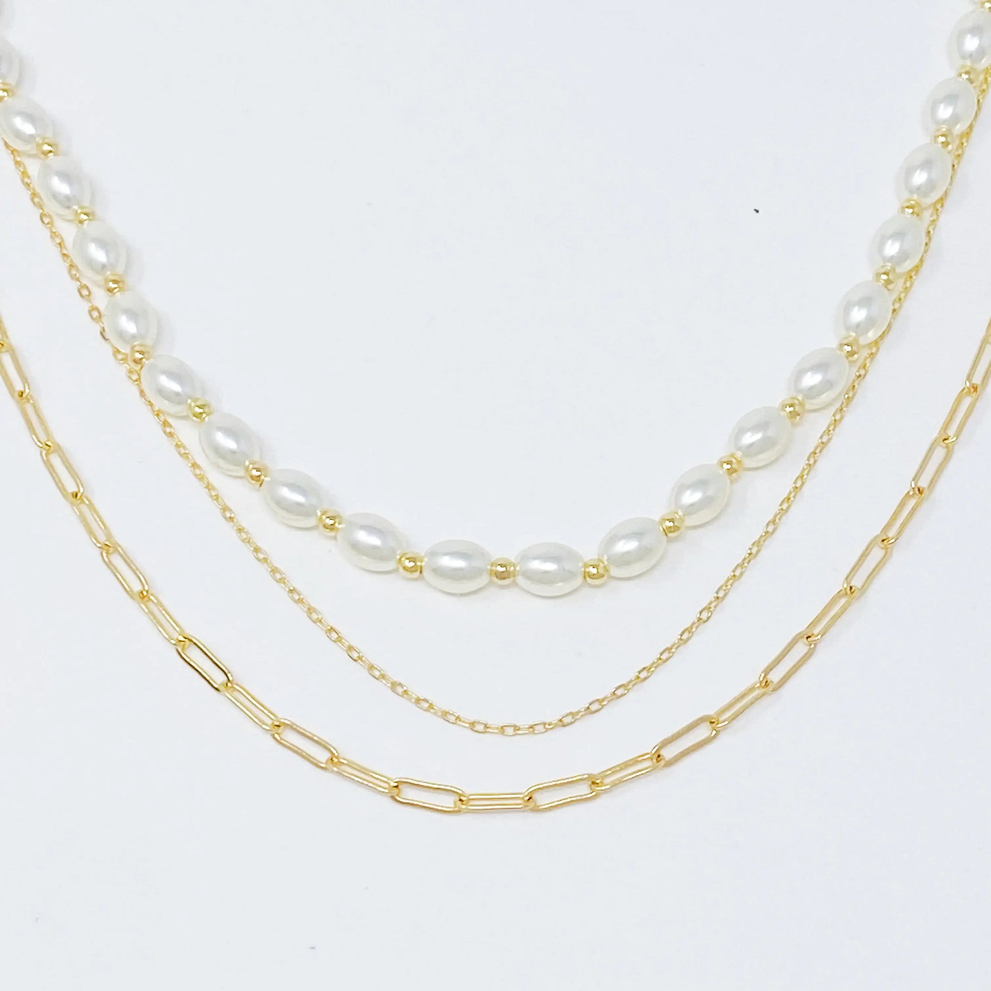 - Design: Three-layer necklace combining a mix of gold chains and pearl beads for a balanced, classy-meets-trendy look.