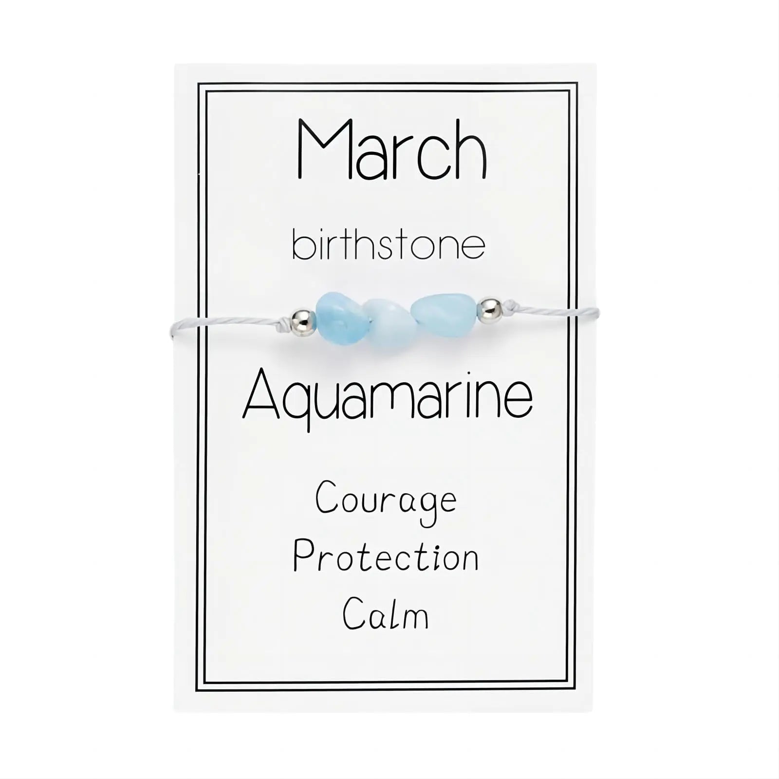 Discover our authentic March Aquamarine birthstone bracelet - a meaningful and personalized gift for birthdays and special occasions. Featuring genuine aquamarine crystal beads corresponding to March's birthstone, our hand-woven bracelet combines natural stone healing properties with elegant charm bracelet design.